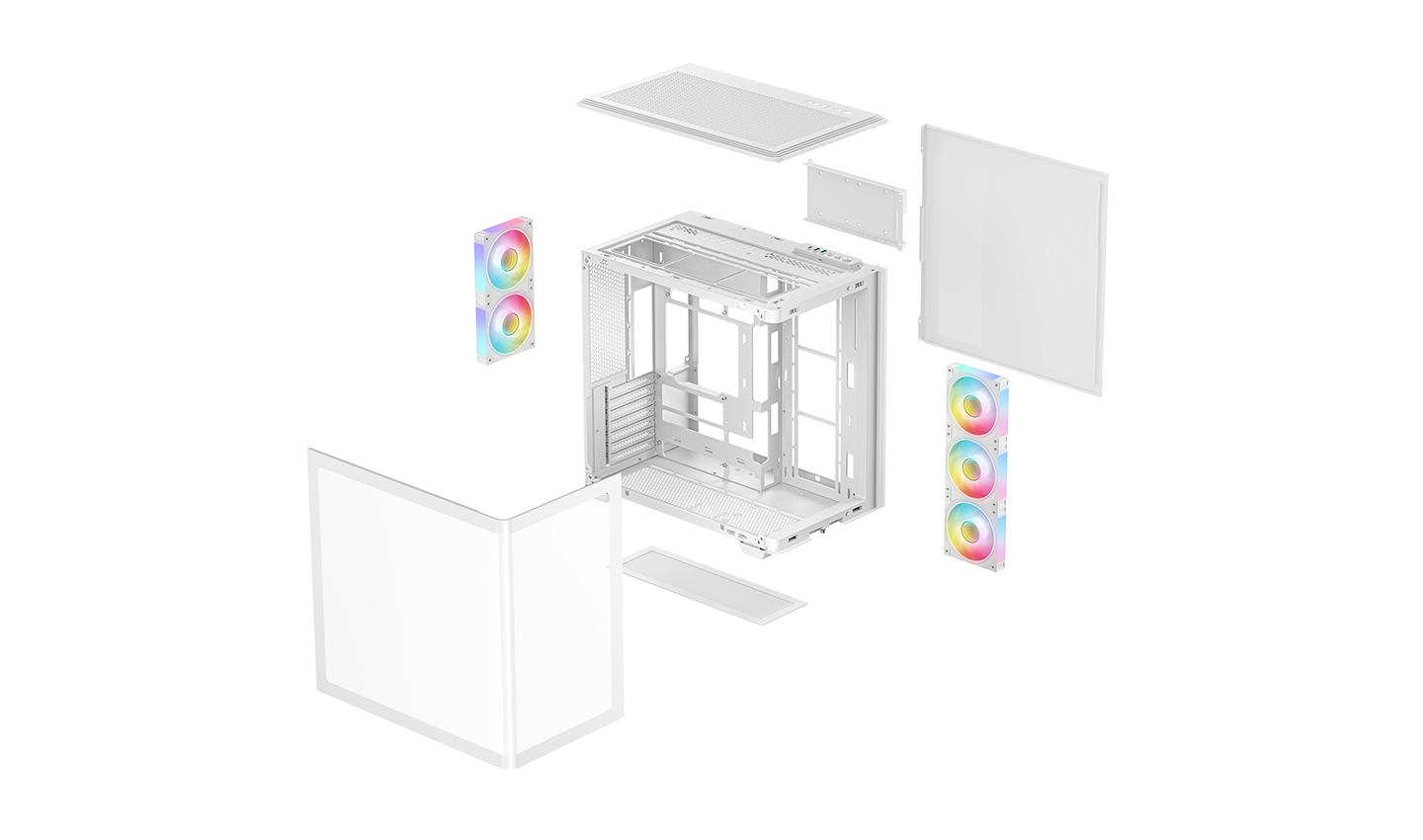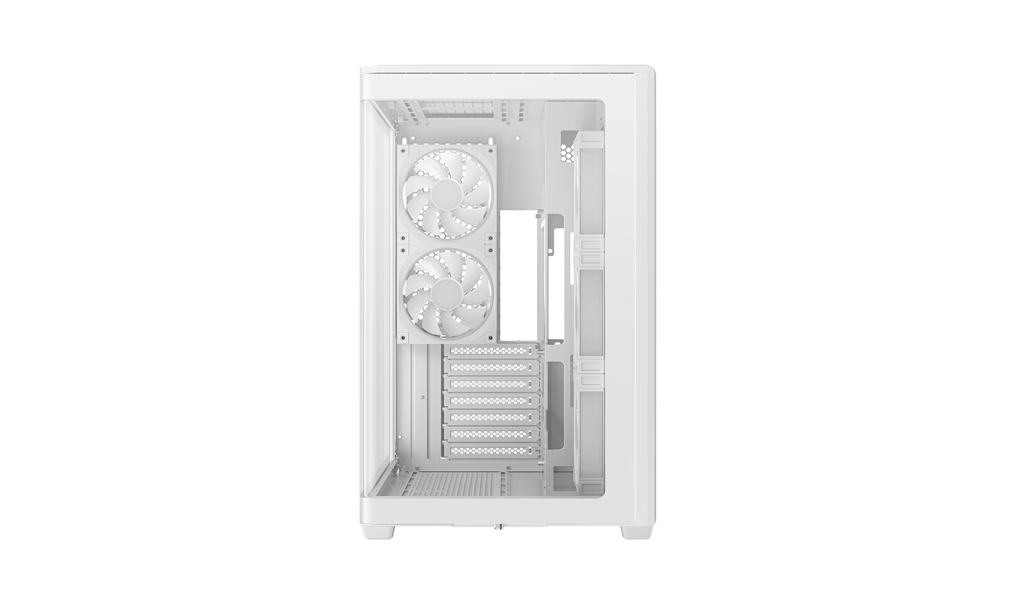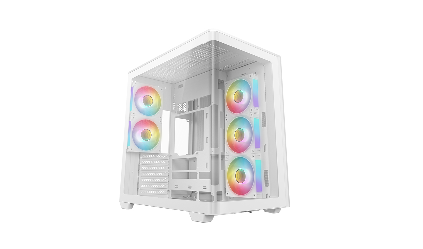 CG590U 5F WH, çift bölmeli tasarımı sayesinde geniş iç mekana sahip, kavisli camı ile panoramik bir kasadır. İçerisinde monte edilmiş beş adet ARGB fan bulunan kasa, güçlü hava akışı ve canlı aydınlatmasıyla ilk andan itibaren kullanıma hazırdır.