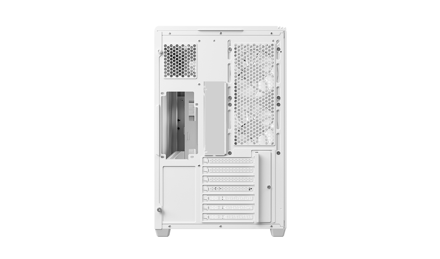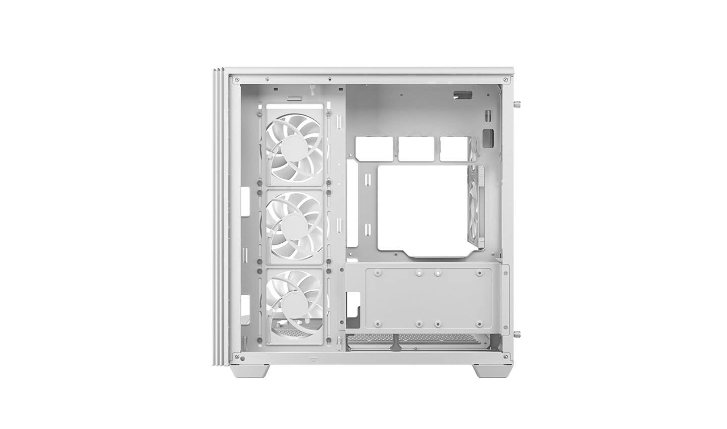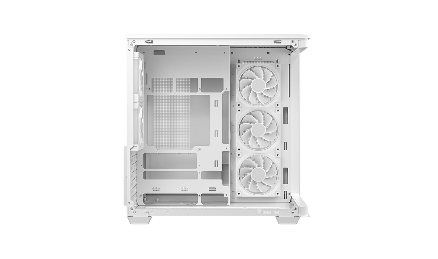CG590U 5F WH, çift bölmeli tasarımı sayesinde geniş iç mekana sahip, kavisli camı ile panoramik bir kasadır. İçerisinde monte edilmiş beş adet ARGB fan bulunan kasa, güçlü hava akışı ve canlı aydınlatmasıyla ilk andan itibaren kullanıma hazırdır.